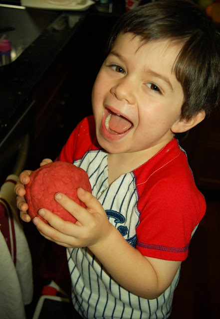 Last Friday, Landon and I decided to make our own playdough. The Play Doh that we buy from the store always dries out, so I thought we would try to make our own. It is so easy and cheap to make. We only made one color, but plan to make other colors. This recipe gave us the perfect amount to play with. Next time for demonstration purposes, I might not choose red as the color choice since it resembles a brain when you drip the red food coloring onto the dough. Here is the recipe: